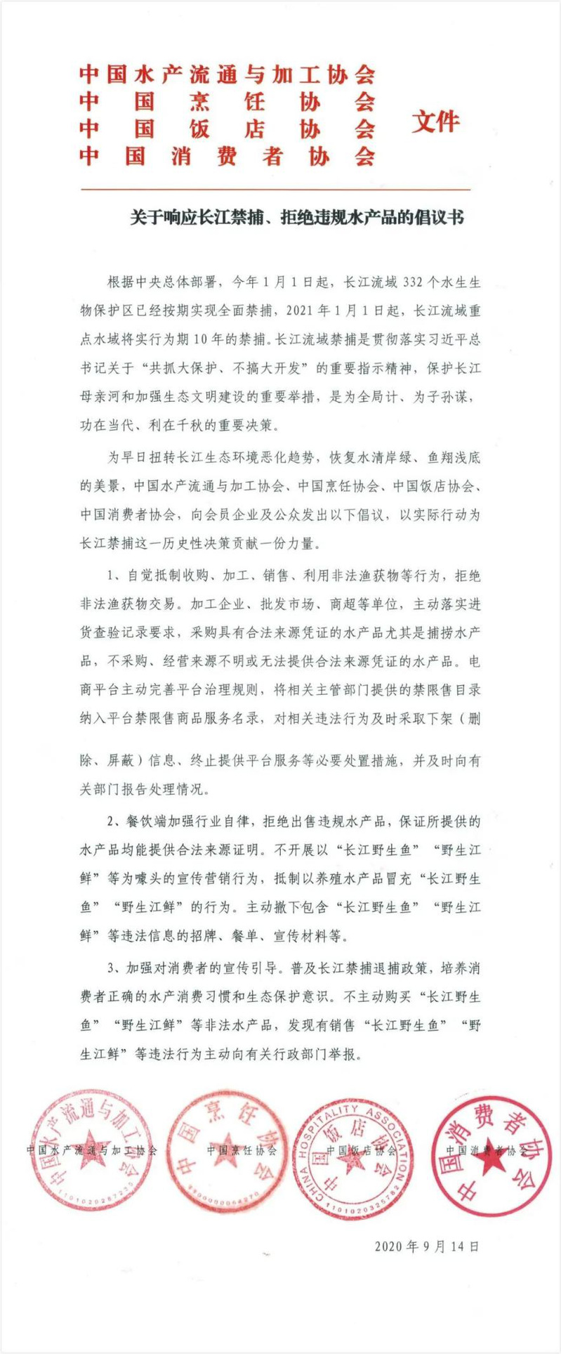 据该微信公众号贴出的《关于响应长江禁捕、拒绝违规水产品的倡议书》(下称《倡议书》)指出,为早日扭转长江生态环境恶化趋势,恢复水清岸绿、鱼翔浅底的美景,中国水产流通与加工协会、中国烹饪协会、中国饭店协会、中国消费者协会,向会员企业及公众发出以下倡议,以实际行动为长江禁捕贡献一份力量。